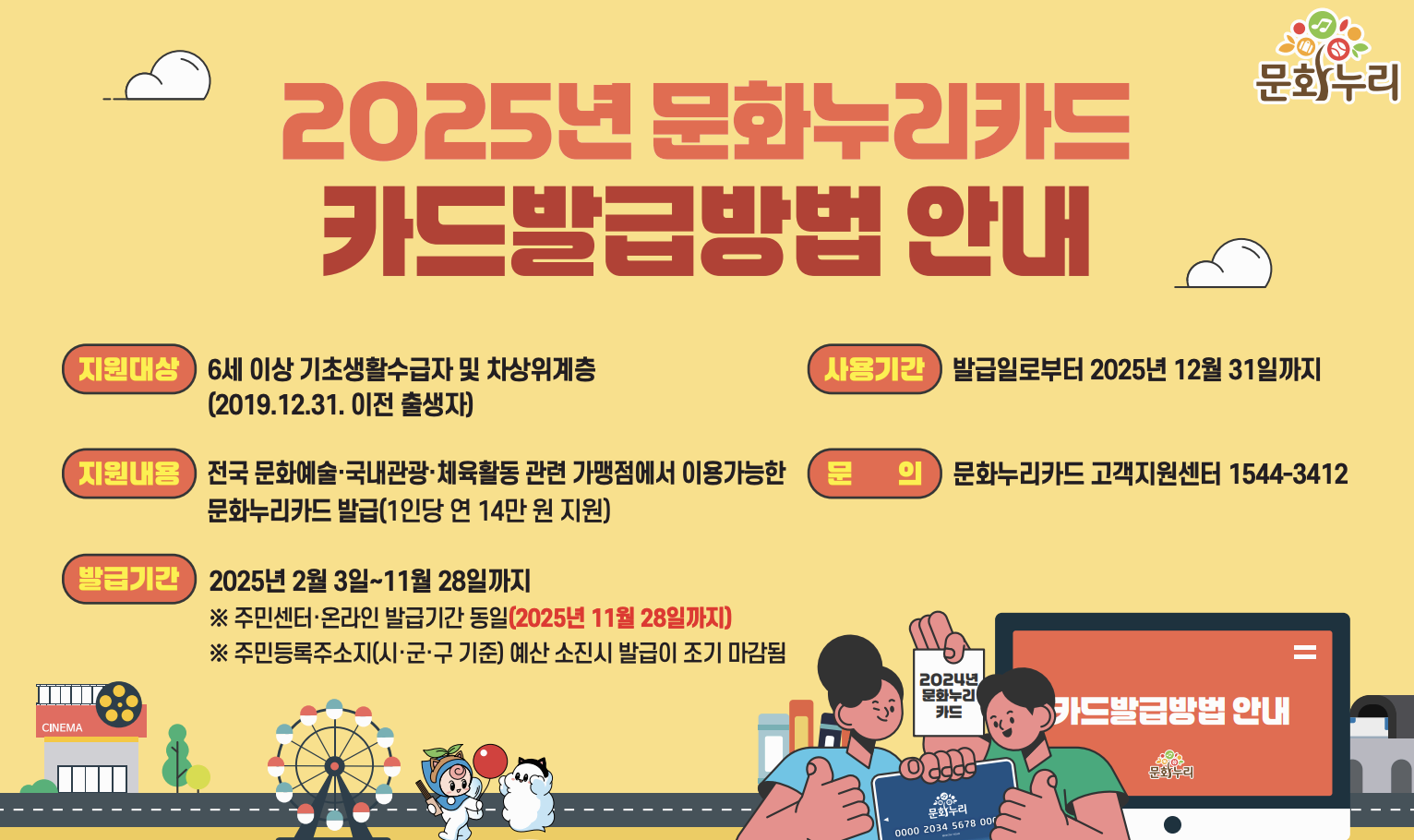 문화누리카드 발급 및 재발급 방법은 온라인이나 모바일앱을 통해 편리하게 신청 가능하니, 미루지 마시고 바로 신청 하시기바랍니다.