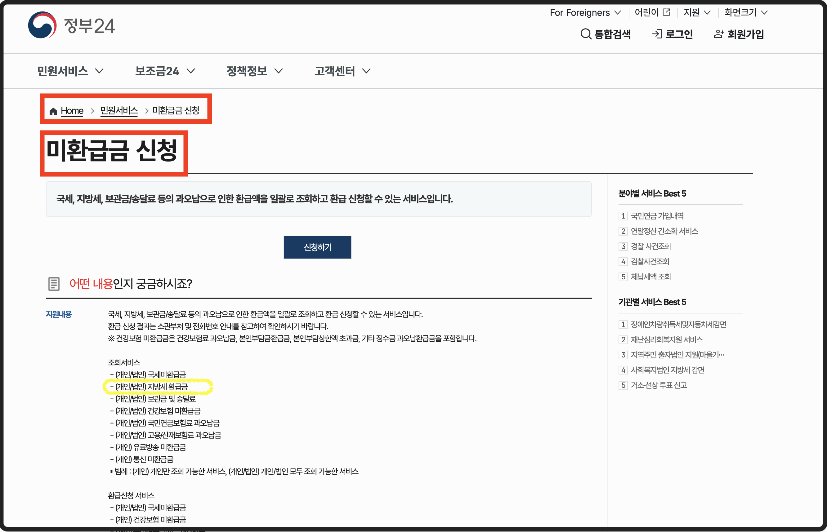 정부 24 누리집에 접속하여 바로 지방세 환급금 조회 및 신청이 가능합니다.